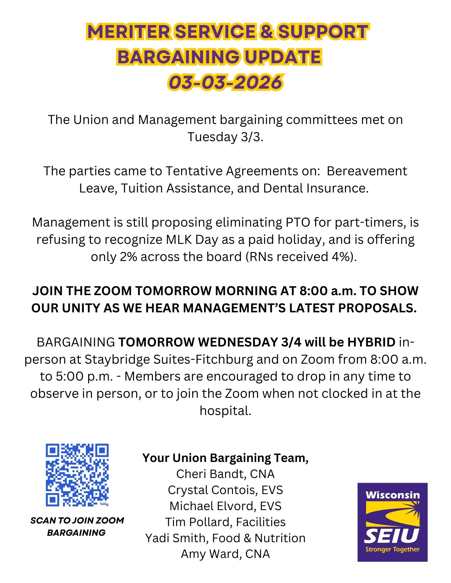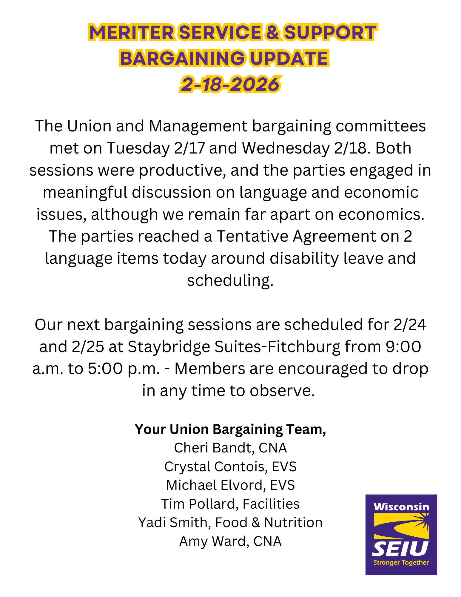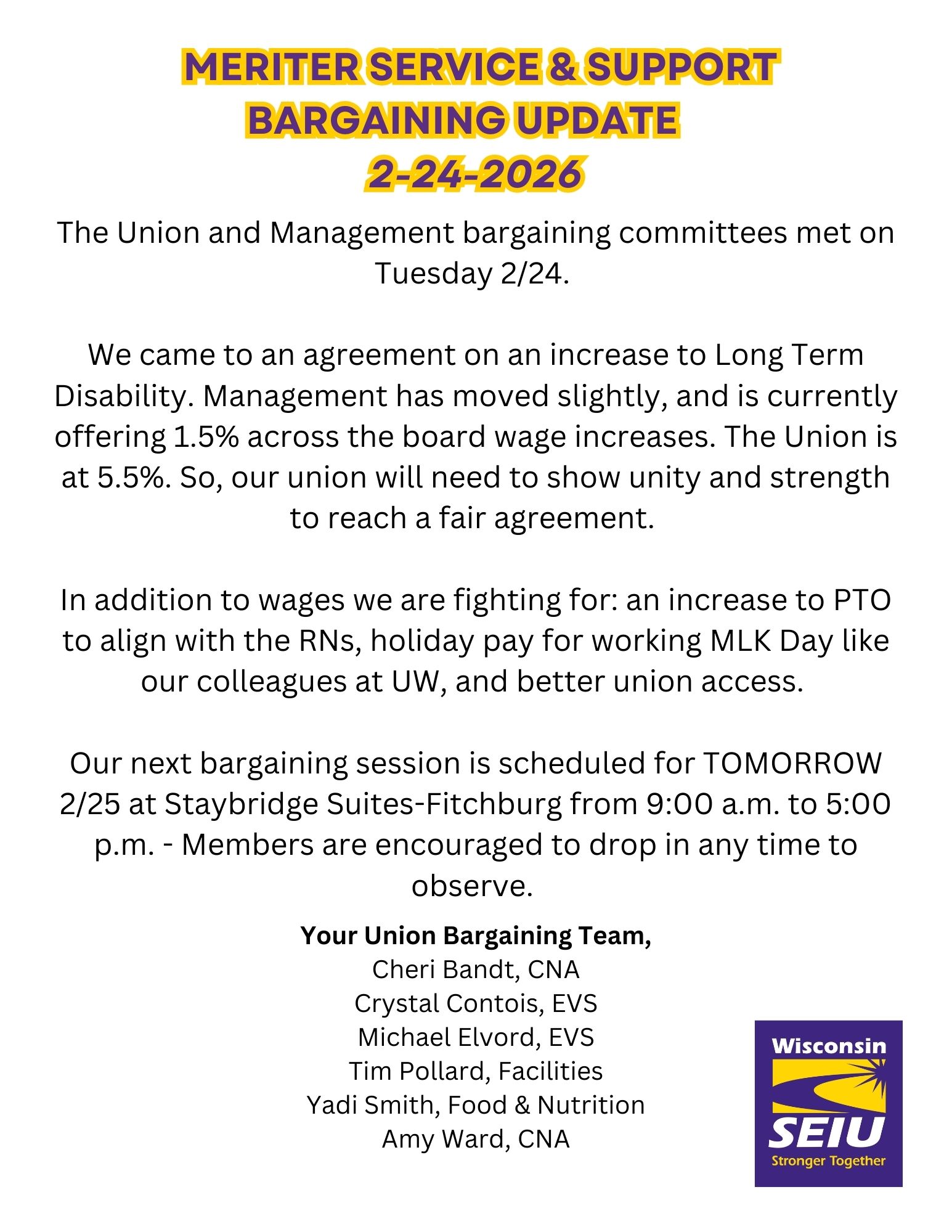 Join In-Person bargaining at Staybridge Suites 2916 Hardrock Rd, Fitchburg, WI 53719